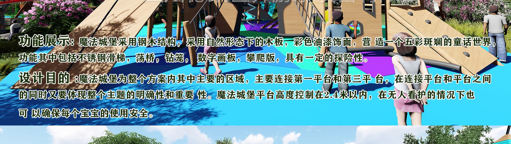 在整個(gè)方案的構(gòu)思上,我們充分考慮到魔幻森林 這一主題,就這一主題思想我們展開了我們的思 維大爆炸,主題設(shè)備為魔法城堡和小螞蟻搬家, 在這里可能顛覆了我們的世界觀,充分考慮到安 全和實(shí)用性,充分滿足客戶的需求。