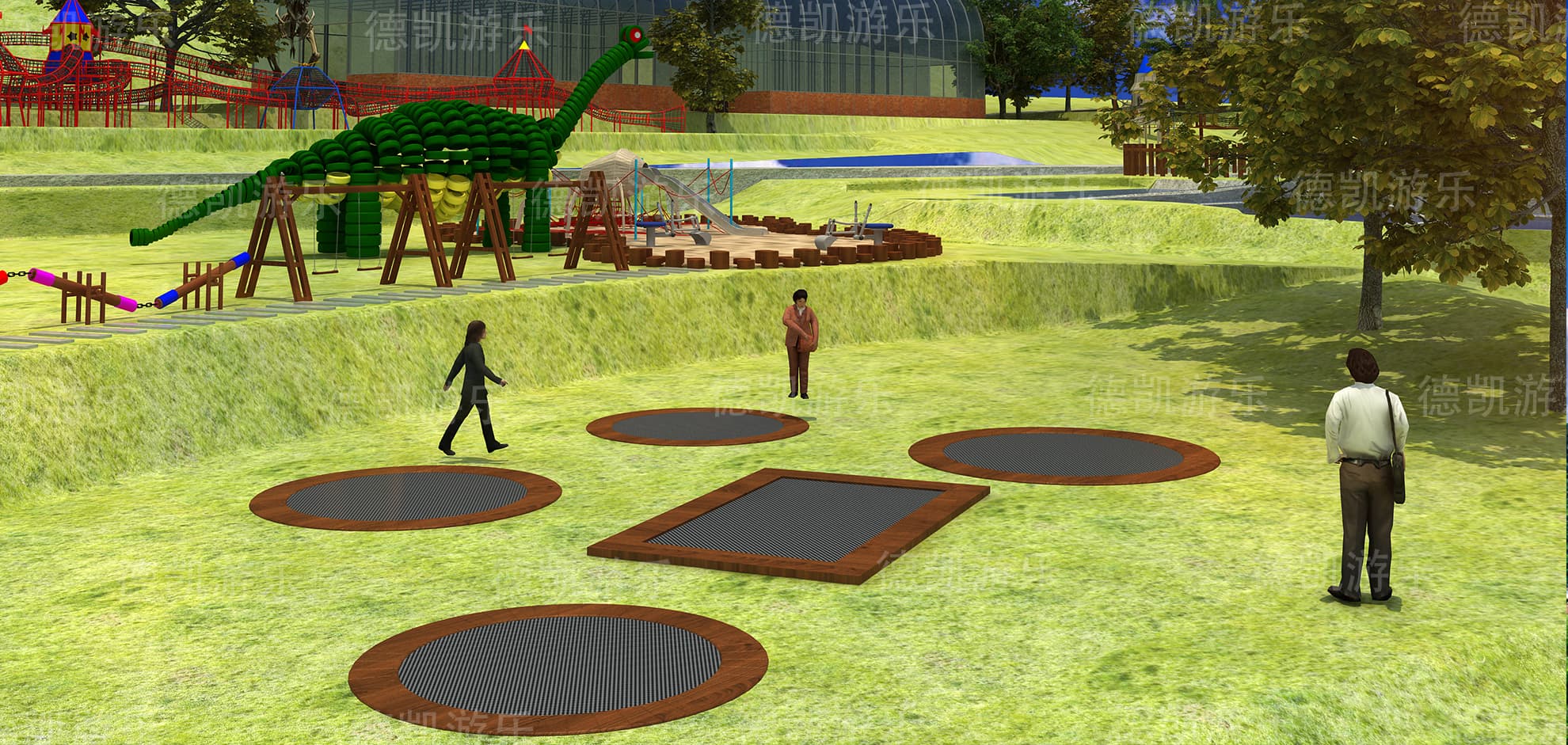 在總體效果圖里面,出來蔥蔥郁郁的植被,最顯眼的就是兒童游樂設備了。叢林里面散步的恐龍、幾個玻璃空間、拓展組合、鉆網(wǎng)滑梯、城堡滑梯、叢林滑梯、小迷宮等。因為叢林植被較密,所以能夠空間的游樂設備有限,而且效果圖整體較小,只能看見比較集中或者大型的游樂設備。